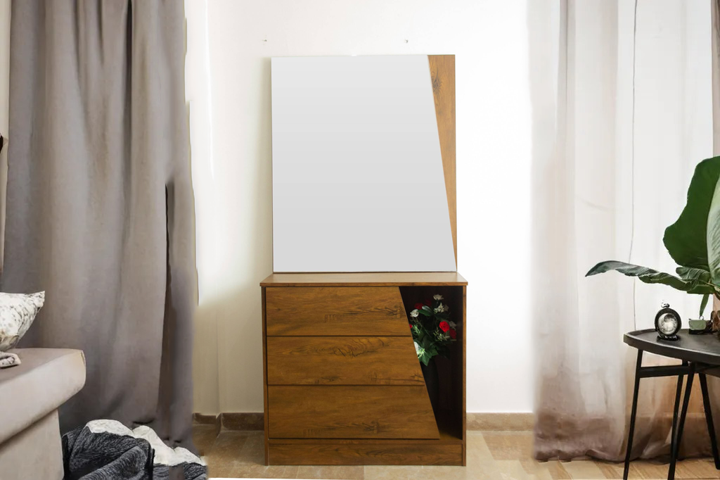 TO-004 Dresser is designed in brown wooden color shade, our dressing table offers both style and functionality, providing a chic space to organize your essentials. Its smart layout and elegant appearance make it a perfect addition to any room.